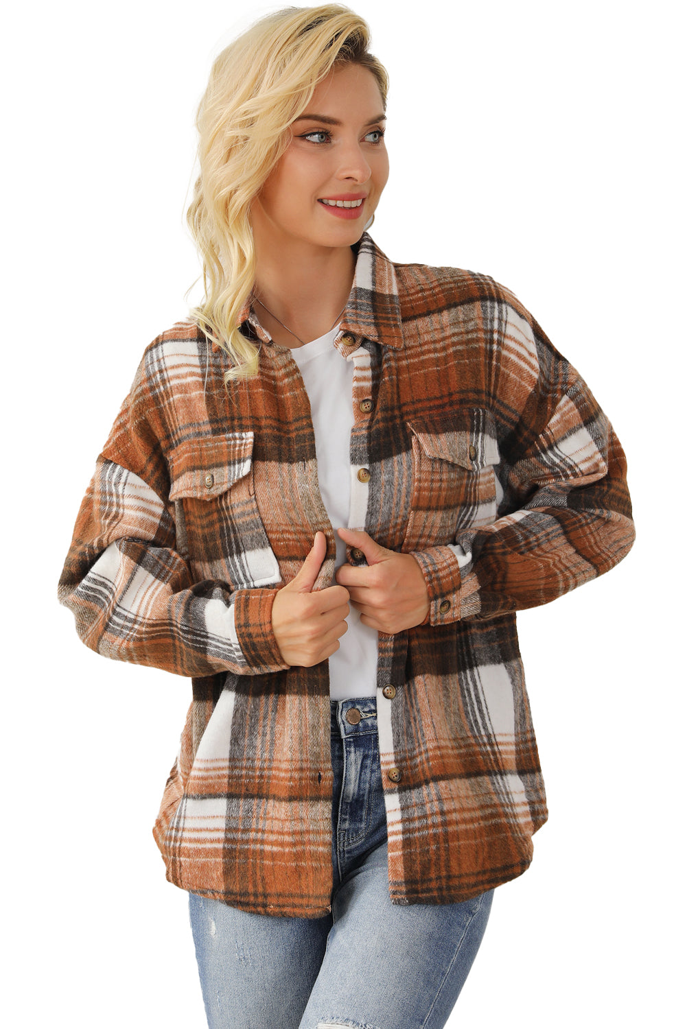 - An allover plaid print, relaxed oversized fit, dropped shoulders, a notched collar, front chest pockets, and tortoise buttons lined down the front and on each cuff