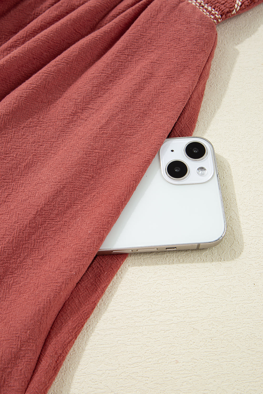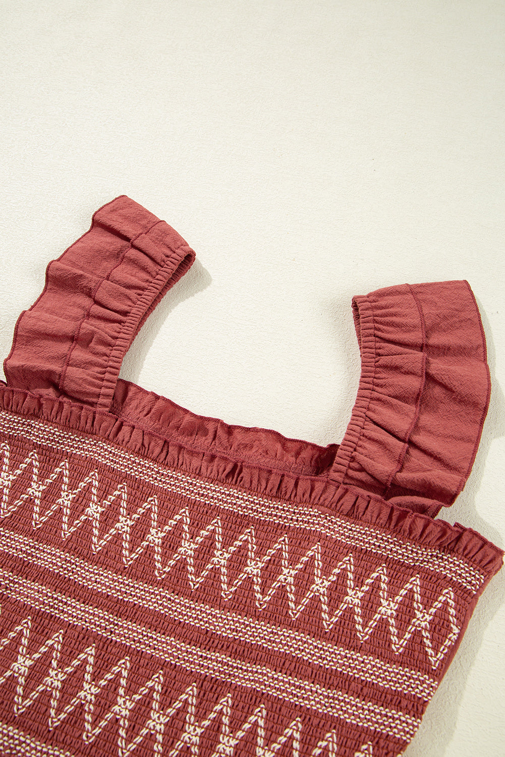 Red Sandalwood Geometric Stitch Shirred Bodice Ruffled Trim Sleeveless Mini Dress